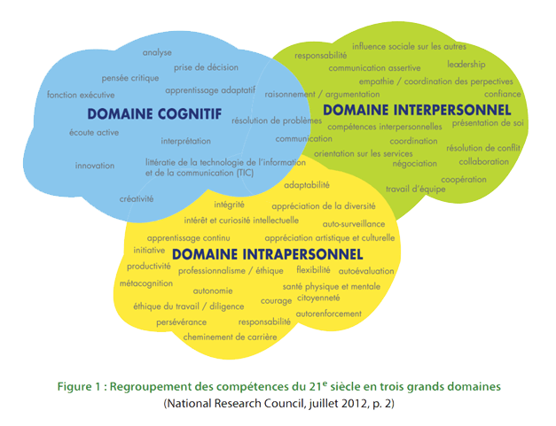 Les compétences transférables se développent pendant l’apprentissage en fonction du degré d’engagement cognitif, social, émotionnel et physique de l’élève et se regroupent en trois grands domaines, soit cognitif, interpersonnel et intrapersonnel.