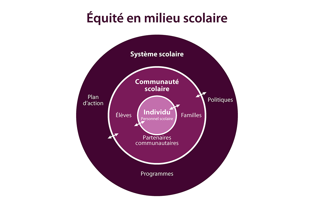 Dans ce cadre, le concept d’équité s’articule autour de deux plans, soit le plan systémique et le plan individuel. Tant sur le plan individuel que systémique, on recommande une prise de conscience collective et individuelle, et une reconnaissance que :