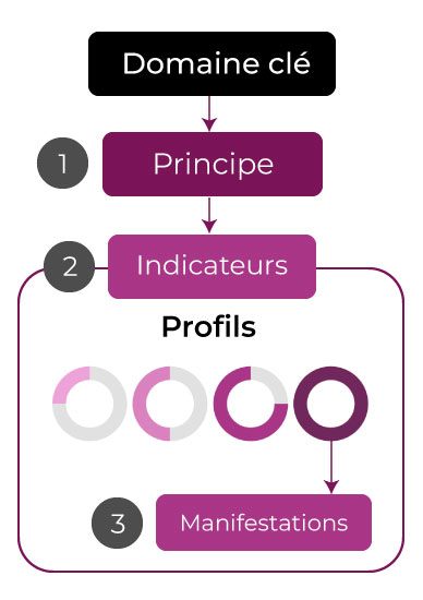Dans chacun de ces domaines, trois éléments vous permettent de poser un regard critique sur vos pratiques, d’élaborer des objectifs d’amélioration et de progresser dans le continuum :